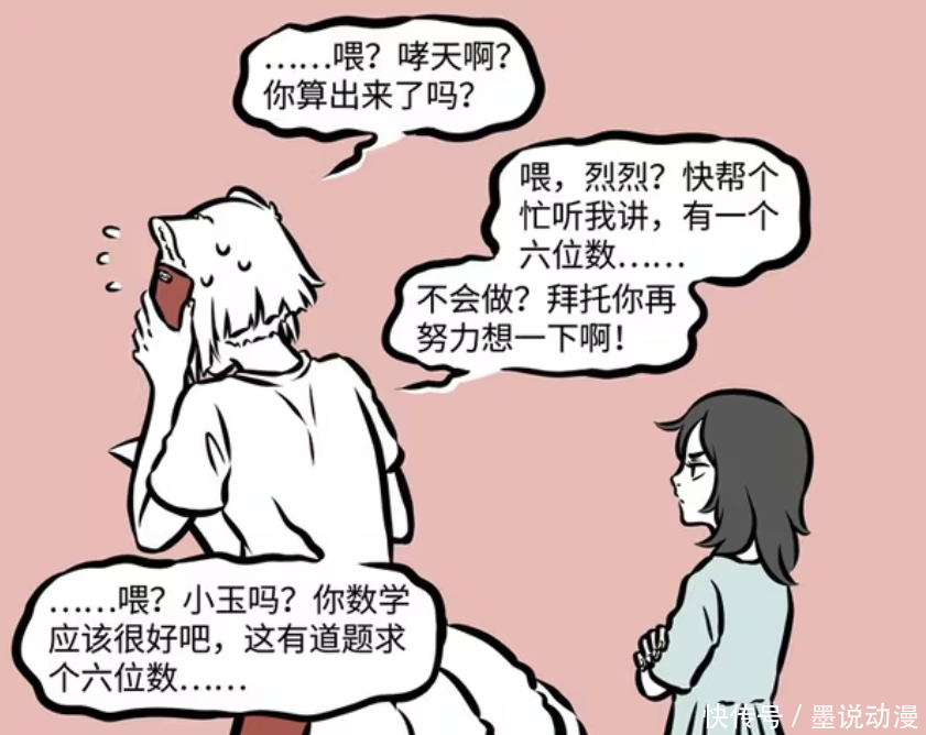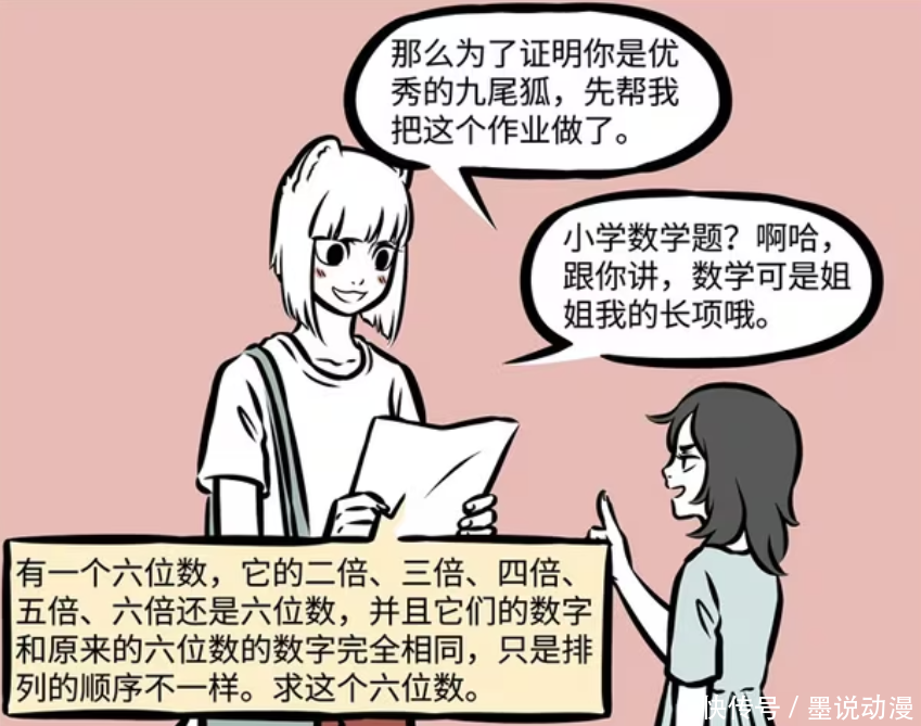 其实就是算六位数,只是这个六位数有个条件,不管是二倍、三倍、四倍、五倍还是六倍都是六位数,另外他们的数字和原来的六位数完全相同,只是排列顺序有所变化。看到这样的题目,九月瞬间就慌了。所以只能求助哮天、敖烈和小玉,没想到他们都无法搞定。