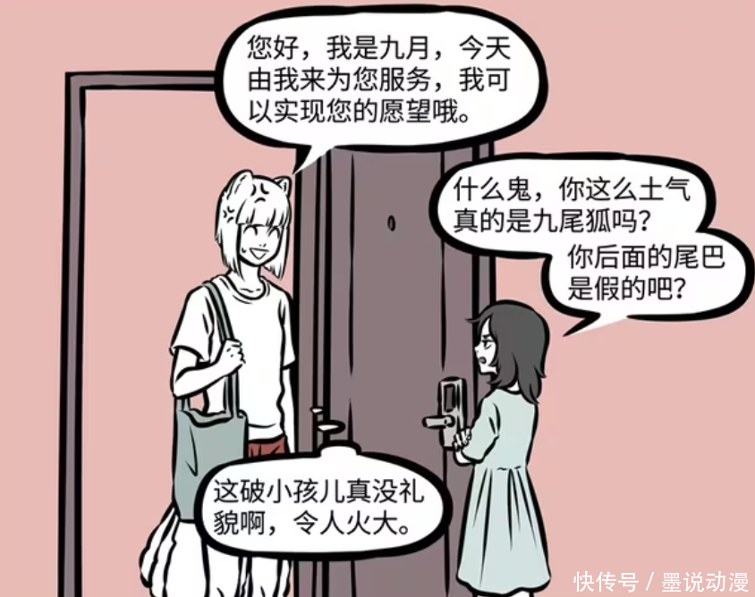 九月硬着头皮去完成第一单,没想到会见到个小学生。九月还被这个小学生吐槽,说九尾狐怎么这么土,后面的尾巴是假尾巴。秉持着不能得罪客户的精神,九月只能强忍怒火。如果不是接单,九月都想揍这小孩一顿。